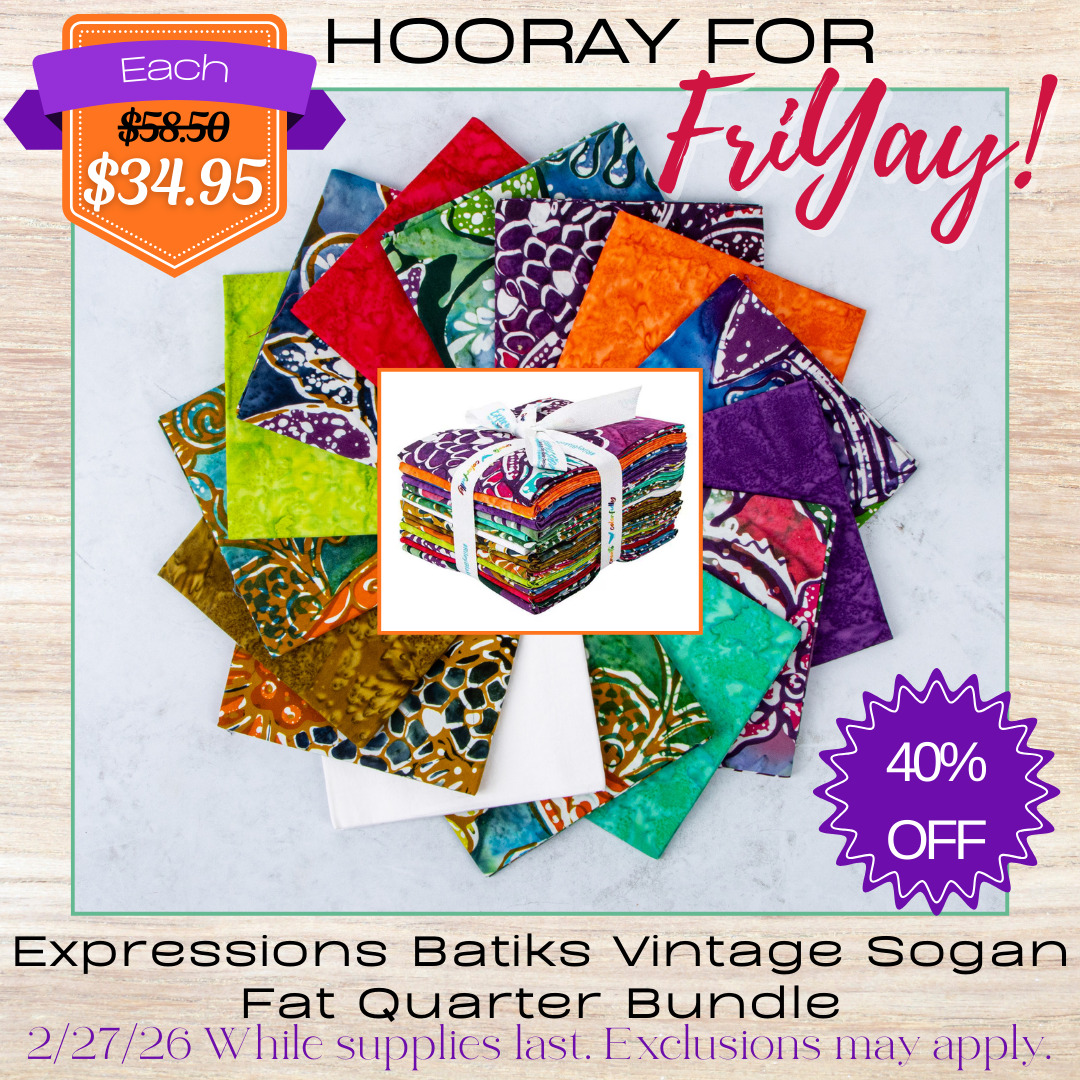 It's our favorite day of the week and we have a new FriYay deal just for you! Grab the Expressions Batiks Express Yourself! Vintage Sogan Fat Quarter Bundle for a fantastic 40% OFF!!! Only $34.95 each today, 2-27-26, while supplies last!