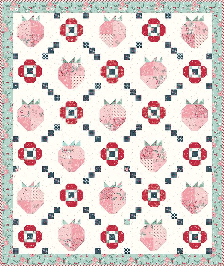The Berry Market Quilt Boxed Kit includes pattern and fabric for quilt top and binding. Backing not included. Fabric featured is Berry Market by Beverly McCullough of Flamingo Toes. Pattern is also by Beverly McCullough. Finished size is 76" x 90". Kit comes in a solid box with a printed belly band label. Box size is approximately 11" x 12 1/4" x 3 1/2".
