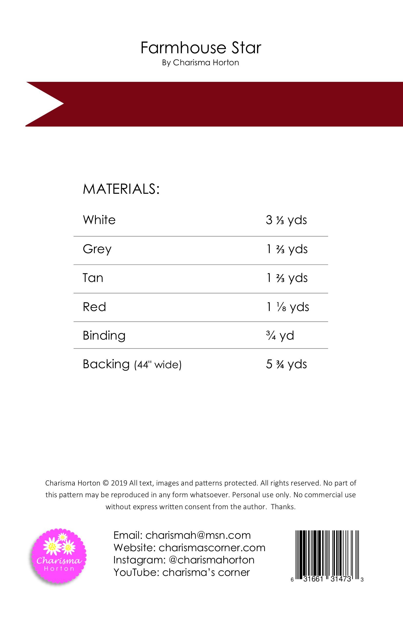 Farmhouse Star is an easy to construct quilt that finishes at 72x96. The simplicity of the design brings a few fabrics to life.