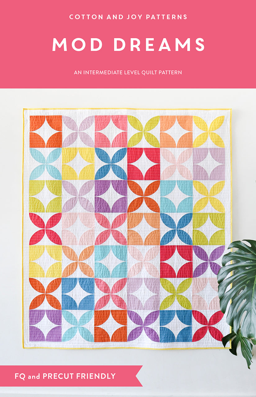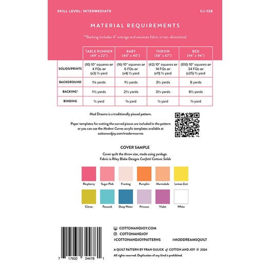 The Mod Dreams Quilt by Fran Gulick of Cotton and Joy features curved piecing that is perfect for beginners or curve enthusiasts. Let your creativity run wild with the many possibilities included in the pattern - use 10" Stackers, Fat Quarters, or yardage. Pattern includes paper templates or it can be paired with the Modern Curves Templates (STT-31846). Pattern includes instructions for Table Runner (22" x 49"), Baby (40" x 40"), Throw (58" x 67"), and Bed (94" x 94") sizes.