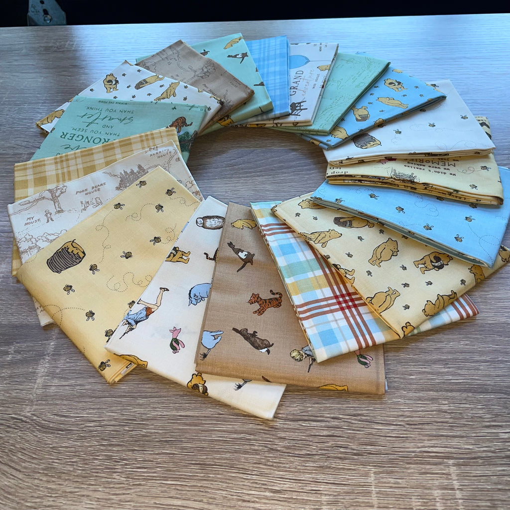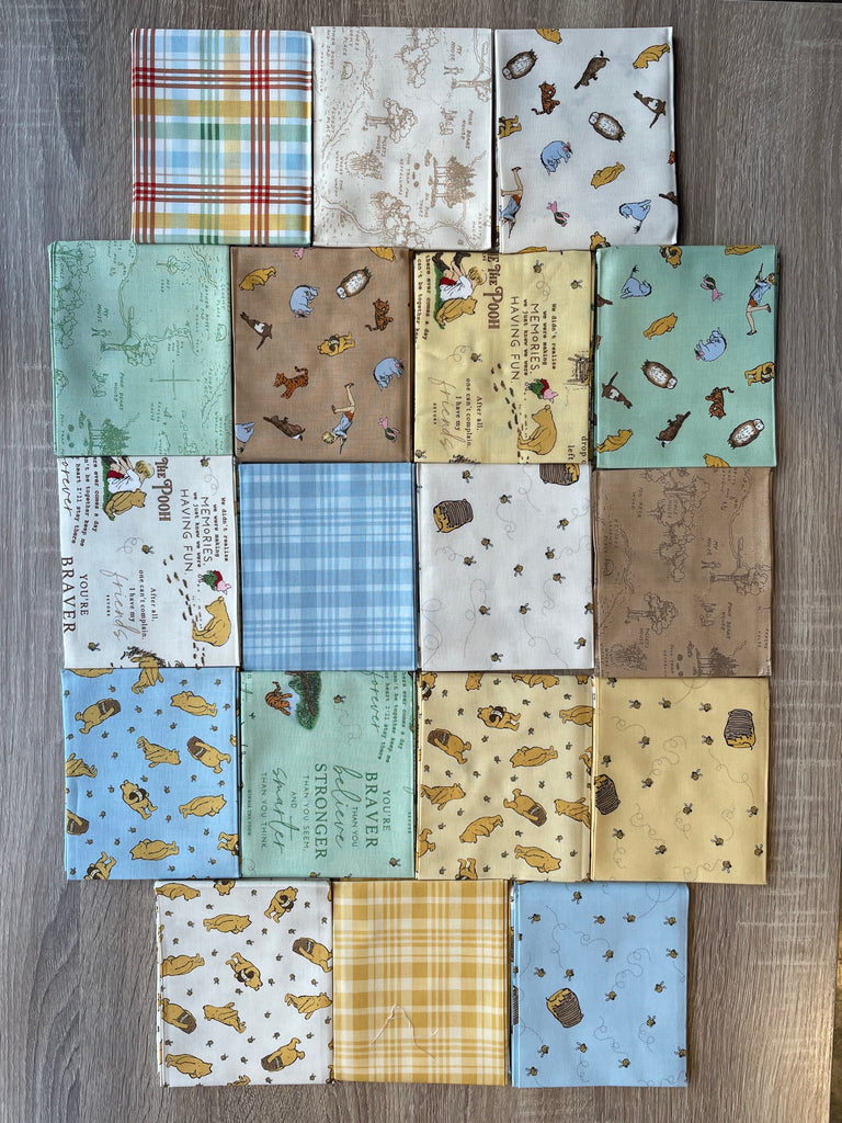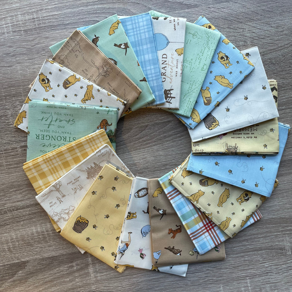 This Fat Quarter precut bundle includes 18 pieces from the Winnie the Pooh collection by Echo Park Paper Co. for Riley Blake Designs.