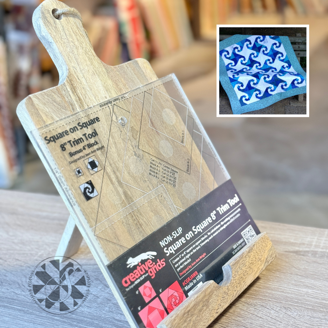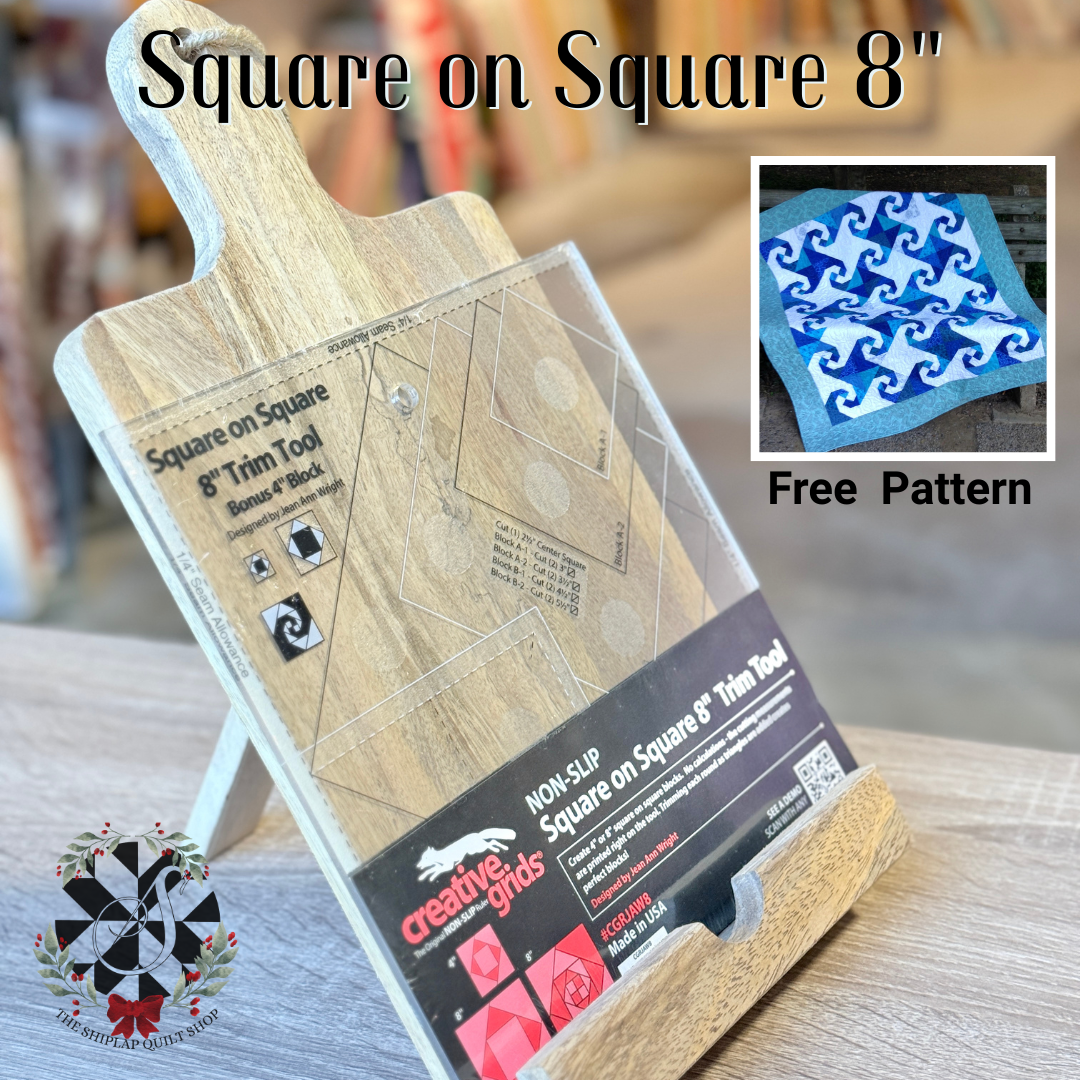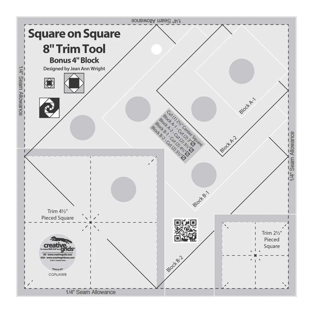 Use this Square on Square Trim Tool designed by Jean Ann Wright for Creative Grids® to create 4in and 8in square on square blocks. The Snail’s Trail blocks are now easier than ever. Simply change the colors of the triangles to create a variety of designs.