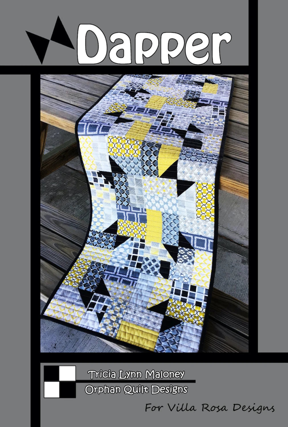 Discover the 'Dapper' quilt pattern, a stylish and vibrant design perfect for adding a touch of elegance to any space. This quilt measures 16" x 48" and is crafted using 2 1/2" strips, showcasing a delightful mix of blue, yellow, and white geometric patterns. The intricate patchwork creates a dynamic visual appeal with arrows and various shapes, making it an eye-catching piece for both home decor and as a unique gift. Ideal for quilters looking to create something distinctive, this pattern is designed by Trina Lynn Maloney for Orphan Quilt Designs.