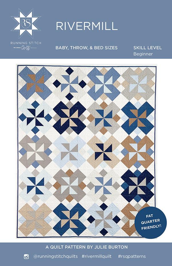 The Rivermill quilt pattern is a modern quilt pattern that takes on the classic pinwheel block. This block-based quilt is a versatile quilt to make because it can be made with fat quarters or half yards. The pattern includes four sizes, but can be easily scaled up or down because it is block based.