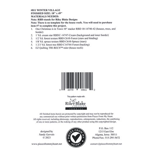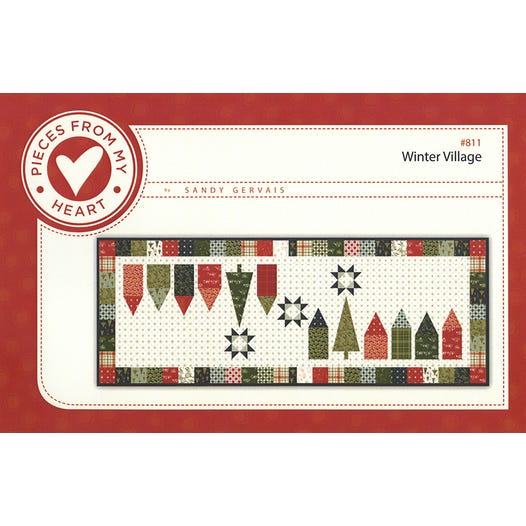 The Winter Village Runner by Sandy Gervais of Pieces from My Heart features a pieced village with houses, stars, and pine trees and is 10" stacker friendly. Finished size is 18" x 49".