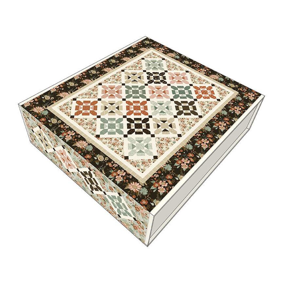 The Let's Get Fancy Quilt Kit includes pattern and fabric for quilt top and binding. Backing not included. Fabric featured is Morning Latte by Sandy Gervais of Pieces from My Heart. Pattern is also by Sandy Gervais. Finished size is 80 1/4" x 102 1/4". Kit comes in a solid box with a printed belly band label. Box size is approximately 11" x 12 1/4" x 3 1/2".
