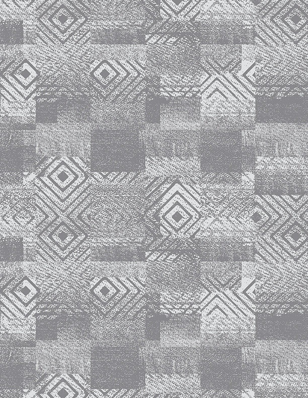 Visually, the fabric features a harmonious pattern of geometric shapes and textured blocks in a calming gray palette.