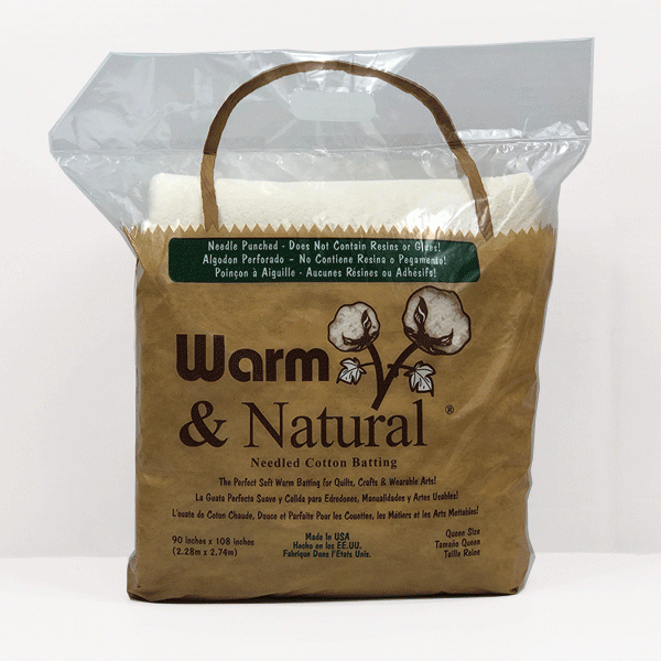 100% cotton fibers go through an ultra-cleaning process, then WARM & NATURAL cotton batting is needle punched to give your punched with hundreds of needles into a strong, thin base quilt the texture you love without glues or resins. WARM & material to prevent tearing, shifting or migration. The NATURAL; will not separate or bunch, quilts up to 10" apart, needling process holds the fibers together without glue or will not beard. Fabric naturally clings to batting and gives resins. The evenly layered fibers stay in place inside your it that antique look. Now easier to hand quilt. Ideal for quilt through generations of washings. 3% shrinkage with any craft project, gives character to soft sculpture dolls. first washing. (you can pre-wash the batting). Quilt or tie Once quilted WARM & NATURAL cotton batting can be machine up to 10" apart, will not beard. Queen size - 90" x 108". washed again and again without fear of separation or bunching.