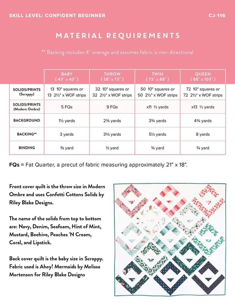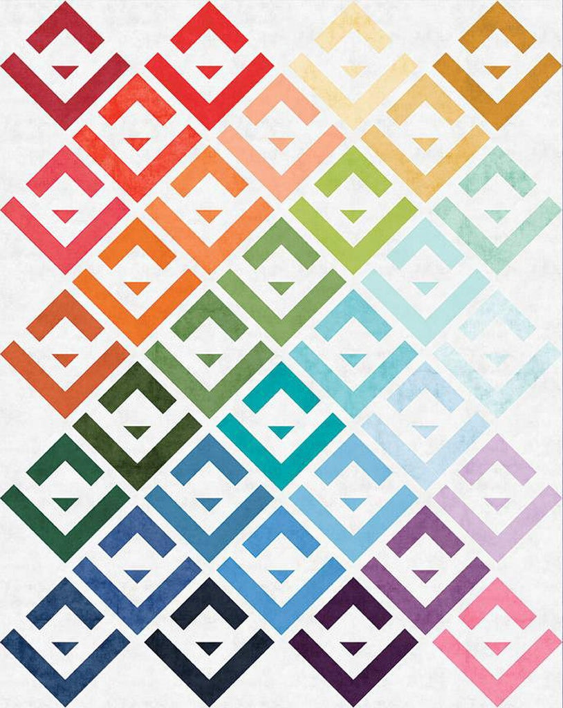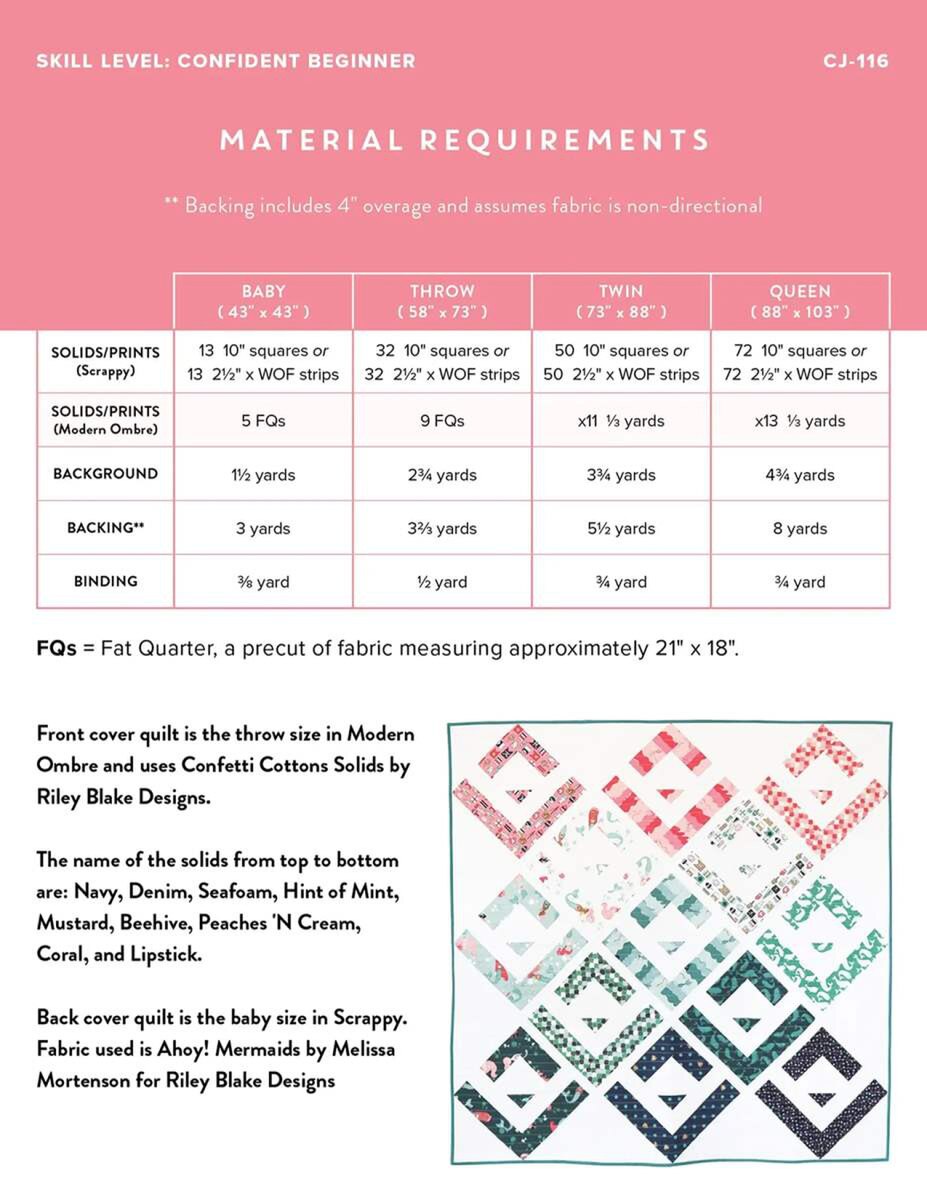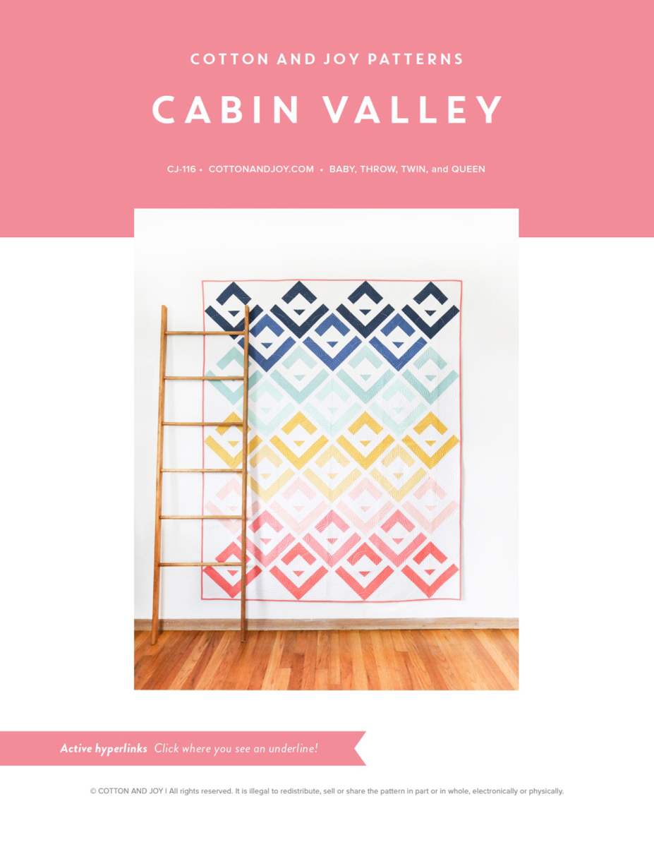 The Cabin Valley Quilt by Fran Gulick of Cotton and Joy is 10-inch stacker friendly and is a fun and modern take on the classic Log Cabin quilt block. The pattern includes two design layouts: Modern Ombre and Scrappy which is precut friendly! This pattern is perfect for beginners ready to tackle on point setting. Pattern includes instructions for Baby (43? x 43?), Throw (58? x 73?), Twin (73? x 88"), and Queen (88? x 103?) sizes. Image shown is Throw size.