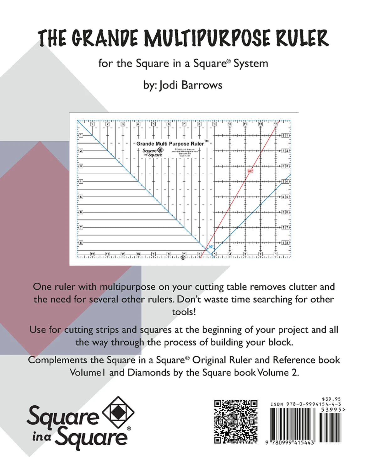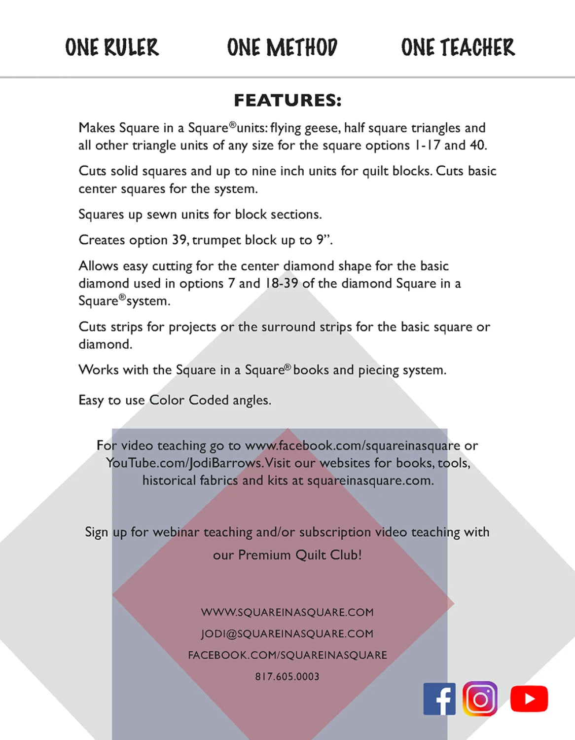 Cut squares, strips, surround strips for basic square Cut the diamond units for the diamond Options Square up blocks Trim flying geese, half-square triangles, quarter square triangles, 14 other Options Complements the Square in a Square technique ruler Easy to see grids, lines, numbers Color coded angles