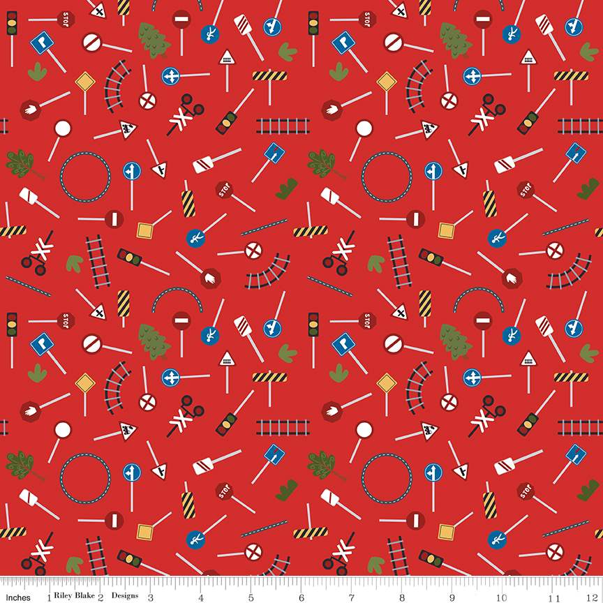 It Takes a Village by Jennifer Long of Sew a Story for Riley Blake Designs is great for quilting, apparel and home decor. This print features street signs, trees, train tracks, and more.