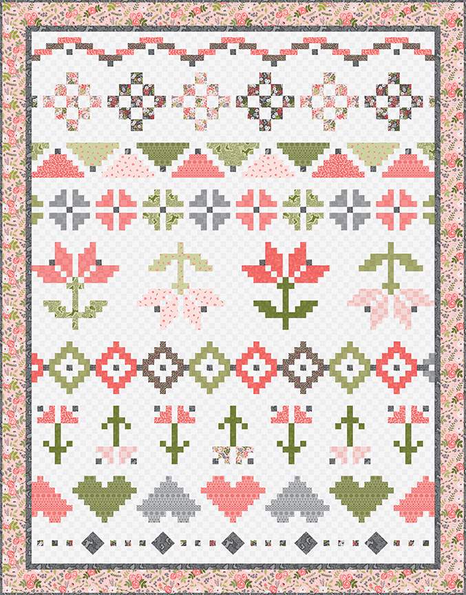 The Knitted Row-Along Sew-Along Quilt by Jill Finley of Jillily Studio features pieced rows of blocks that create a knit-like design. Finished size is 79" x 101".