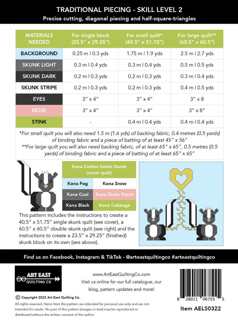 -a 40” x 51.5” quilt depicting our little love-struck skunk friend who just dropped a stink (see front cover)