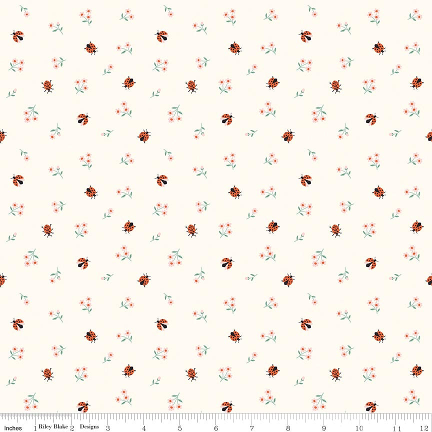 Meadow Moments by Sandra Nygård-Parthoens of Little Forest Atelier for Riley Blake Designs is great for quilting, apparel and home decor. This print features lady bugs and small floral sprigs.