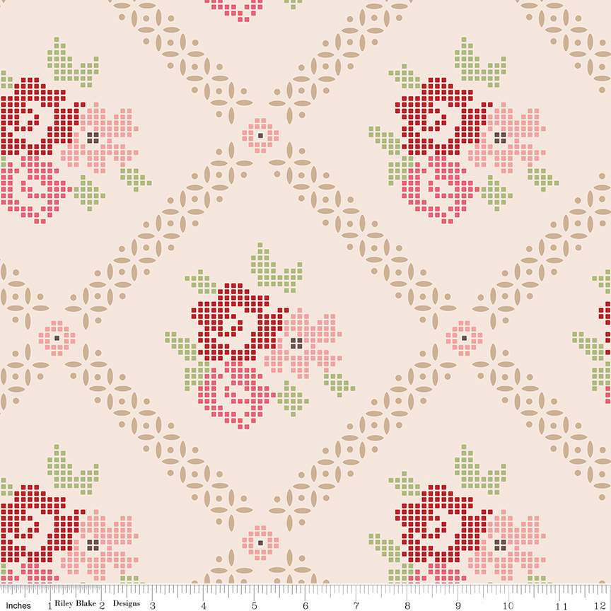 The Mercantile collection by Lori Holt of Bee in my Bonnet for Riley Blake Designs is great for quilting, apparel and home decor. This print features a diagonal gird with cross stitched flowers. It's 107"/108" wide to accommodate most quilt backs.