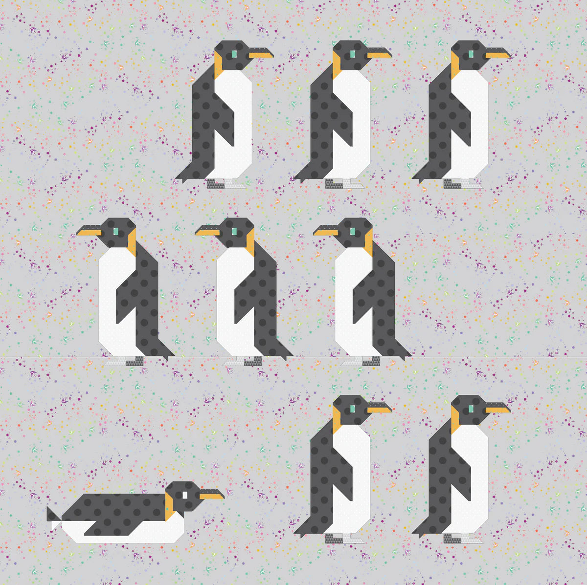 This pattern can be used to make a large lap quilt (60 ½” x 60 ½”), a small quilt or wall hanging (40 ½” x 40 ½”) or individual penguin blocks for other projects. There are two different penguin blocks: the Standing Penguin Block (10” x 15” finished) and the Sliding Penguin Block (18” x 15” finished).